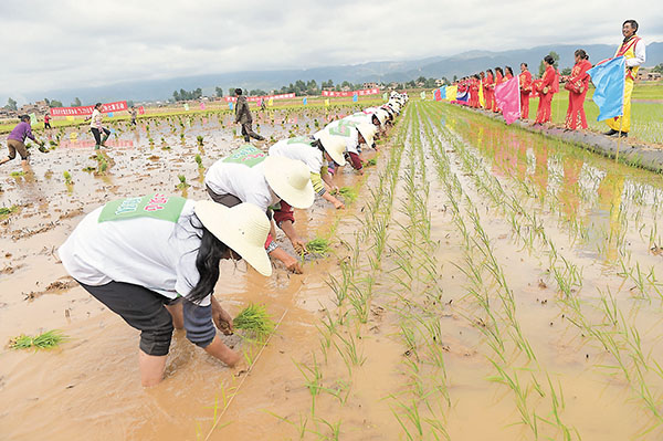 山歌對唱、敲起鑼鼓......在雲南省昭陽區蘇家院鎮雙河村木瓜林貢米基地的稻田裡,一場插秧比賽昨日正在熱烈進行。「木瓜林大米」因品質優良、歷史文化濃厚。早在嘉慶年間就成為進貢朝廷的貢米。民國年間雲南省主席龍雲就曾在此地修建糧倉屯糧(糧倉現還被保存)。 ■中新社