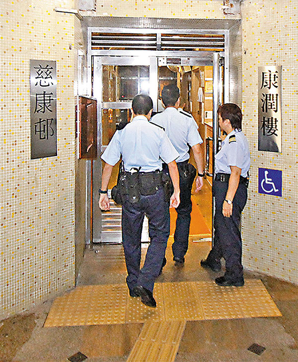■警員到淋腐液案發大廈調查及蒐證。