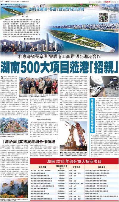 上世紀八十年代,第一批港資入湘投資興業。三十載風雨而過,在承接產業轉移大浪潮的助推下,如今香港已成為湖南第一大貿易夥伴。為搶抓國家大力推進「一帶一路」、加快實施粵港澳服務貿易自由化以及港資港企大規模向中西部地區加快轉移的重大歷史機遇,推動港湘經貿合作的縱深發展,2015湖南(香港)投資貿易洽談周將於5月31日至6月3日在香港和珠三角地區舉辦。據瞭解,湖南省人民政府省長杜家毫親自率團訪港並會晤香港工商界人士,進一步推動深化港湘兩地的經貿合作。