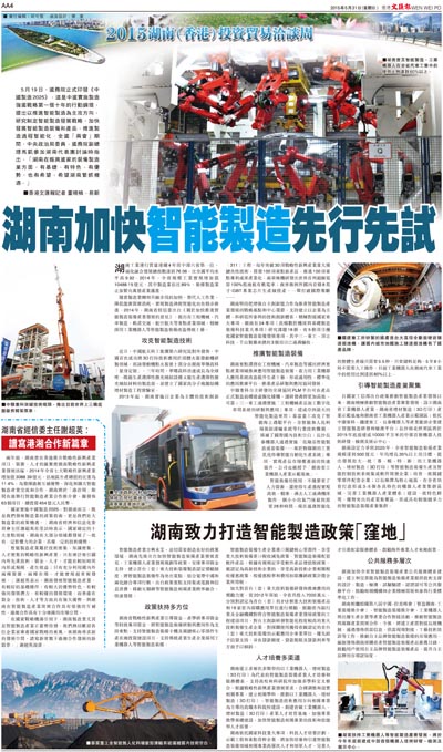 兩年前,湖南曾在香港推介戰略性新興產業項目,資源、人才的匯聚使湖南戰略性新興產業發展迅猛,2014年全省七大戰略性新興產業增加值3088.39億元,佔地區生產總值的比重為11.4%。為發揮港湘互補優勢,深化和擴大智能製造產業交流和合作,湖南將於「港洽周」期間在港舉行智能製造產業合作推介會,擬發佈63個項目,總投資454億元人民幣。
