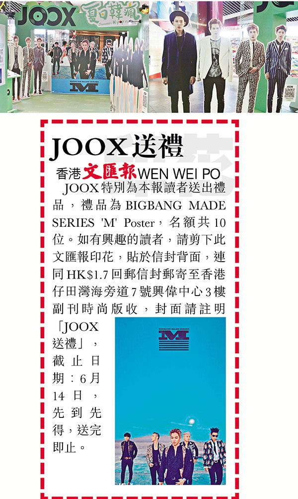 ¥Ñ§Y¤é°_¦Ü6¤ë28´Á¶¡¡AÁú°g̨ìJOOX¡u®L¤éÁúºÆ¡vÅu¦ì¡]®Ô»¨§{7¼Ó¡^§¹¦¨«ü©w¥ô°È¡A§Y¥iÀòÃØª¢®L°·Å¥²³ÆªºBIGBANG¯È®°©ÎCNBLUE°g§A¯ÈµP¤A¥÷¡C¦P®É¡A¦b³o¨à¥un®i¥ÜJOOX¤â¾÷app¡]°Ñ¥[ªÌ»Ý¾Ö¦³30¤Ñ©Î¥H¤WªºJOOX VIPªA°È¡^¡A²{³õ°Ñ¥[¦³¼ú¹CÀ¸¡A§Y¦³¾÷·|ŨúÂ×´I§«~¡A¥]¬AJOOX 1¦~VIPªA°È¡B¡uBIGBANG 2015 WORLD TOUR [MADE] ¡v»´ä¯¸ªù²¼¤Î¶q¬ö©À«~µ¥¡Cº½ü¹CÀ¸±N©ó¤µ¤Ñ¡]6¤ë7¤é¡^±ß¤W10®ÉºI¤î¡A¦Ó¥¼¯àűo¤j¼ú¤§°Ñ¥[ªÌ¡A±N¦Û°Ê¶i¤J²Ä¤G¶¥¬q¹CÀ¸¨Ã¦³¾÷·|Àò±o2¦Ü5¼ú¡A²Ä¤G¶¥¬q¹CÀ¸ªººI¤î¤é´Á«h¬°6¤ë28¤é±ß¤W10®É¡C¦³Ãö¹CÀ¸¸Ô±¡¤Î²Ó«h½ÐÂsÄý¡Ghttp://tinyurl.com/pcoqj7d¡C