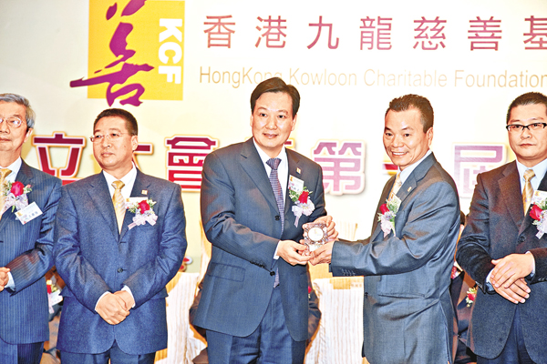 張國榮於香港九龍慈善基金會就職禮上,致送紀念品予中聯辦副主任林武。