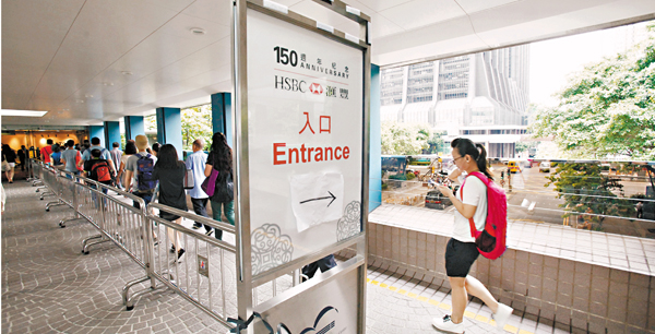 ■在灣仔會展中心,昨晨排隊領取匯豐紀念鈔的人龍較首天為少,秩序大致暢順。 曾慶威 攝