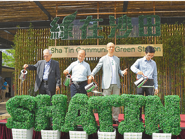 試營運1個月的「綠在沙田」昨日正式開幕,環境局局長黃錦星(右二)出席開幕禮。「綠在沙田」是全港首個社區環保站,負責營運的基督教家庭服務中心表示,未來將推出「草地教室」、「竹棚生活館」、「2次方」計劃等,在社區推廣惜物減廢和綠色生活。 ■記者 羅繼盛