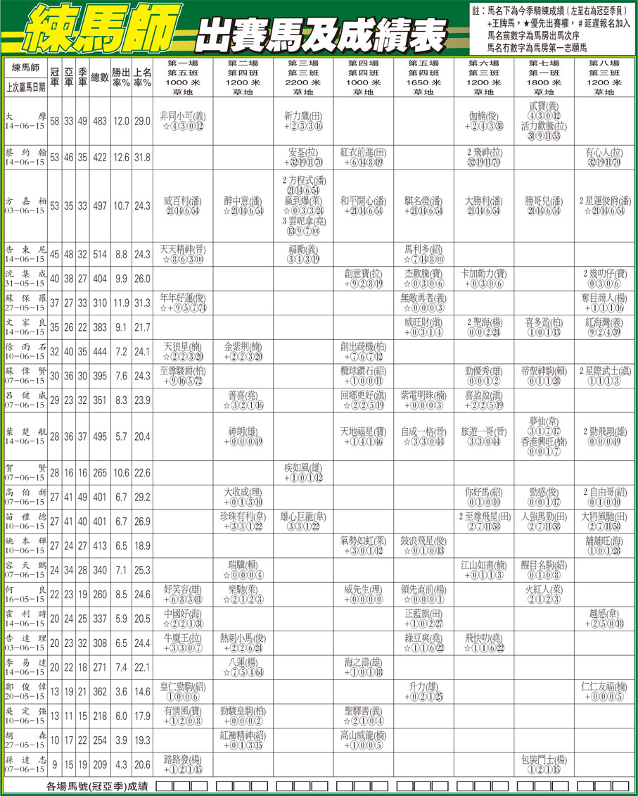練馬師出賽馬及成績表 (2015-06-17) (圖)