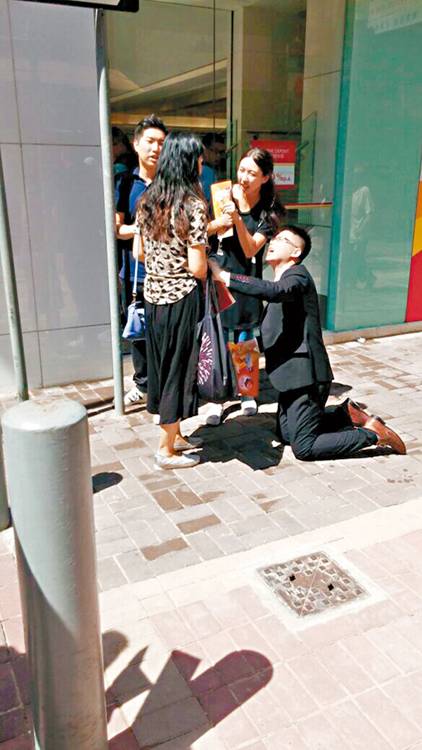 世道搵食艱難,有民眾拍攝到,近日大埔一個拆售商場的附近,有3名代理一字排開向一名女士介紹項目,其中一名身穿西裝的男代理更當街跪下,相片在網上流傳並引起討論。有業界人士指,當下代理市道僧多粥少,但認為「唔使做到咁」。據了解,是次拆售項目「大日子商場」由資深投資者尹柏權持有,位於大埔鄉事會街,涉及220舖位,總值約4億元。