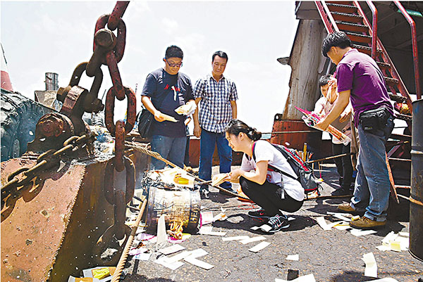 ■家屬在發生意外躉船上哭祭死者。