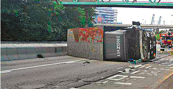 ■16噸貨車在葵涌道撞壆後翻車,橫亙路中。