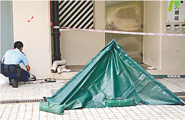 而一名44歲姓譚男子,昨日凌晨零時在沙田新翠h新偉樓高處墮下,跌落簷篷再反彈落地,頭爆肢折內臟四溢當場慘死,保安員發現報警,並用雨傘遮蓋濺在地上的腦漿。警方調查後聯絡事主家人到場認屍,各人傷心飲泣,需警員在旁安慰。消息稱死者有情緒病,與家人同住。