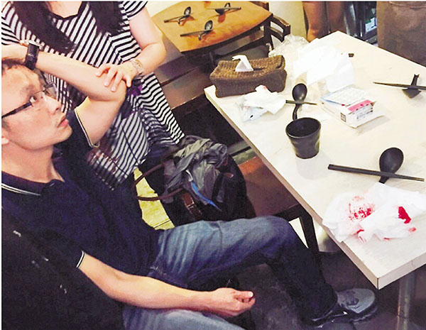 ■遭墮窗擊傷的男事主在食肆內接受包紮。