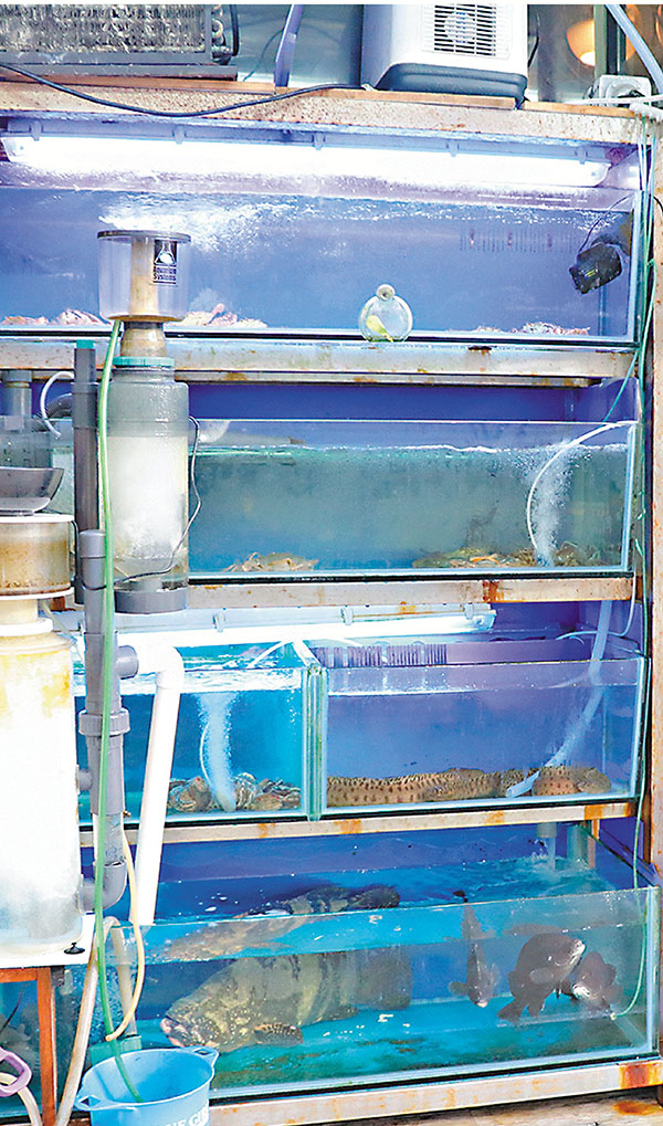 ■食肆上、中兩層魚缸內大隻的龍蝦膏蟹全遭人撈走。 劉友光 攝
