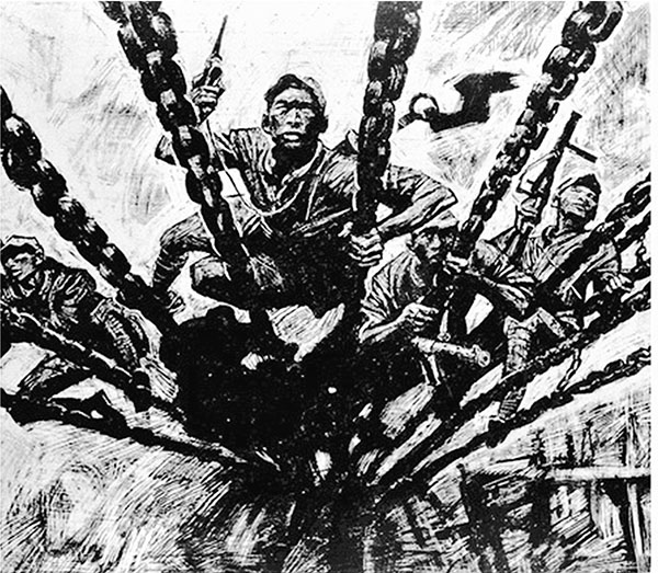 ■畫家筆下的「飛奪瀘定橋」(版畫作品)。 本報四川傳真