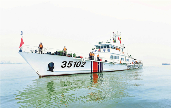 海警35102艦20日列編福建省海警第二支隊服役,這是福建泉州至莆田海域目前噸位最大、信息化程度最高、抗風力和續航力最強的618B型海警艦艇。該艦可在5級海況下正常進行海上巡邏任務,6級海況下安全航行,抗風能力為10級,能大大提高惡劣天氣和遠海災難救援的能力。 ■中新社