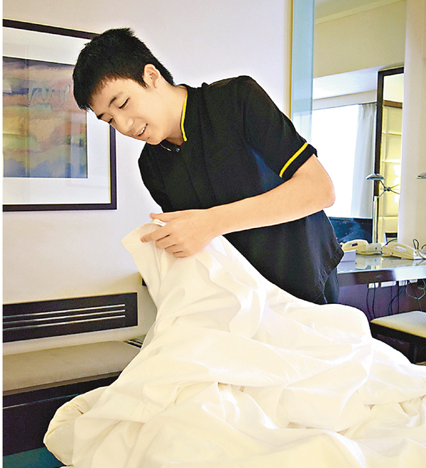 ■梁卓謙在富豪九龍酒店房口部學習執房,兩三天內學會整理房間和床鋪。大會供圖