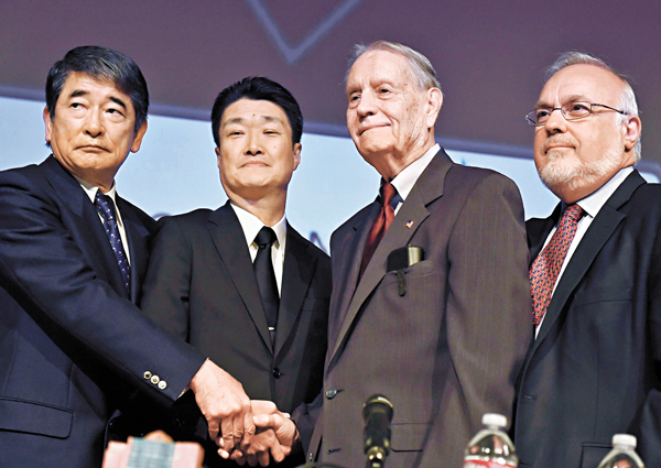 ■墨菲(右二)接受三菱綜合材料的道歉,並與對方代表握手。 法新社