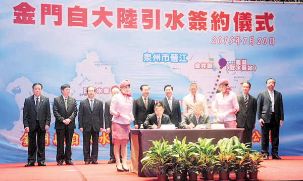 香港文匯報訊(特派記者 米南 金門報道)金門民眾期盼20多年的引陸水、解水荒之夢即將成為現實。福建省省長蘇樹林昨日率團跨海,與金門縣政府簽署「金門自大陸引水計劃供(購)水合同」。這項兩岸民生「第一工程」有望在今年10月啟動,2017年建成投用。