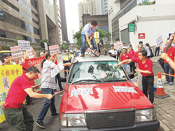 數十名來自汽車交通運輸業總工會的士司機分會、城市的士車主司機聯會及新界的士司機聯會代表,昨日駕駛約20輛的士到運輸署抗議「白牌車」影響生計,並以鐵錘砸爛的士車窗、車頭燈,並把車身砸致凹陷,其間一名的士司機被玻璃割傷。的士團體又將咪錶交還運輸署代表,諷刺的士「按錶收費」名存實亡。