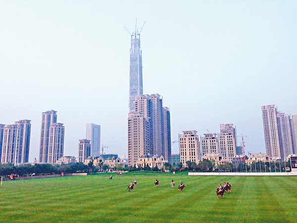 ■高銀地產天津項目中的地標摩天大樓「高銀金融117」,其核心牆已興建至115樓或相當於約567米。採訪當日旗下天津環亞國際馬球會正舉辦「環亞馬球大學邀請賽2015 - 倫敦盃」,由倫敦大學對哈佛大學。曾敏儀 攝