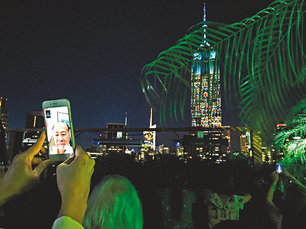 李嘉誠透過Face Time軟件直擊現場情況,全神貫注觀看基金會參與贊助的帝國大廈投影秀。