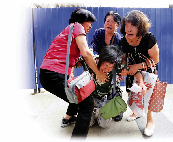 ■兒媳和孫女三人失蹤的中國家屬在馬航北京辦事處外傷心得跪倒地上。路透社