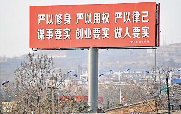 ■山西省曾遭塌方式腐敗,運城市平陸縣政府在街頭樹立廉政標語警戒黨員幹部。 資料圖片