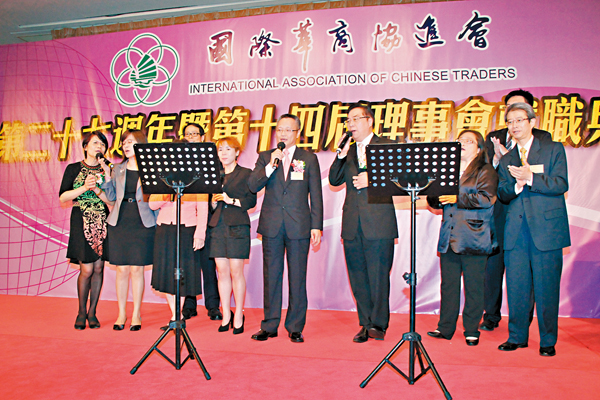 ■於國際華商協進會就職典禮上與同仁一起高歌。