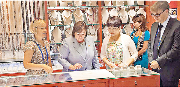 ■捷克總統夫人(左二)挑選珍珠首飾。網上圖片