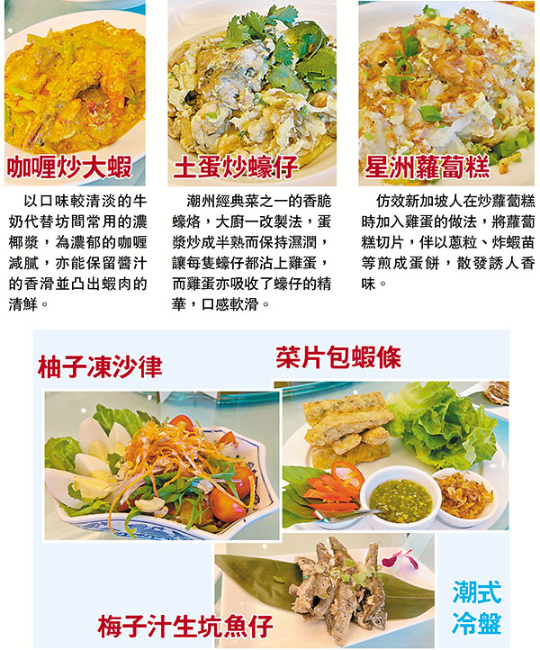 今次品嚐的菜式主要分東南亞風味與傳統潮菜兩大類別,前者偏濃、香,多用香料提味,煮法以油炸、香炒為主,亦重視醬汁的配搭,菜式佐以魚露、豆醬、梅汁、沙茶醬等點綴;後者保留地道作法,以簡、儉、樸為重心,用料正宗,風味親切。一般潮式小食如粿條、魚丸、煎蠔餅流傳至東南亞後,製法用醬皆有所演變,但不變的仍為其中精髓與手造功夫。如大家也想一嚐,不妨由即日起至10月31日到潮江春及潮庭品嚐。