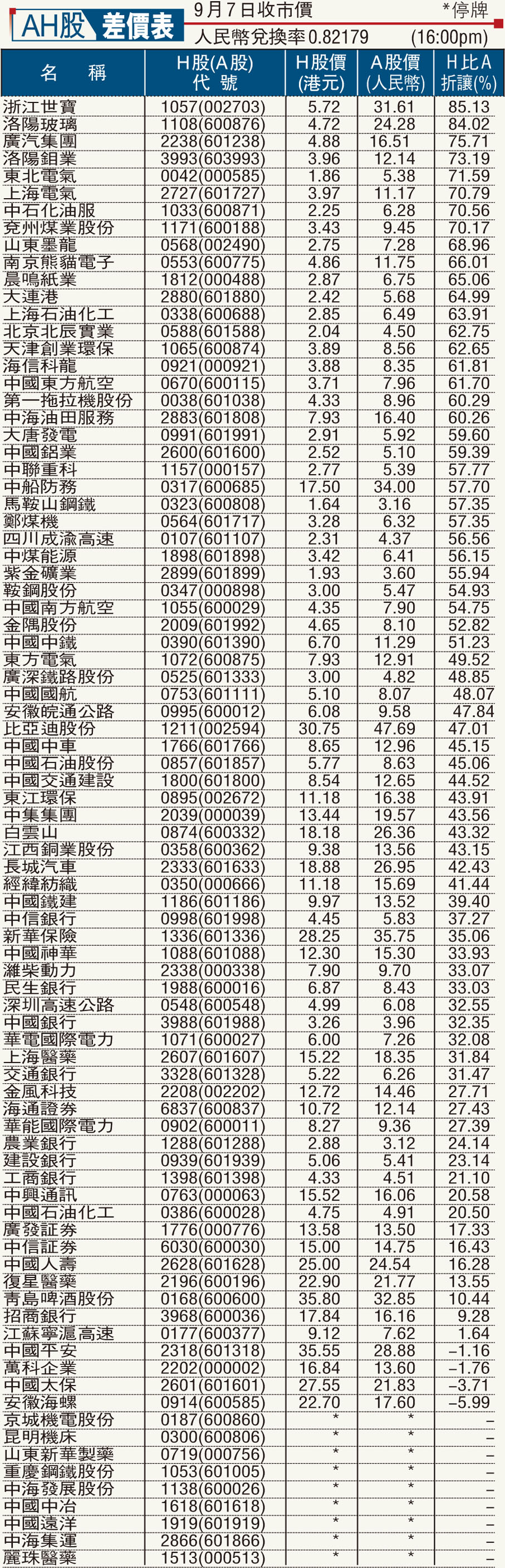 AH股差價表 (2015-09-08) (圖)