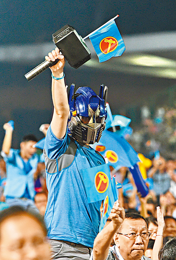 ■面具人高舉大槌撐工人黨。 法新社