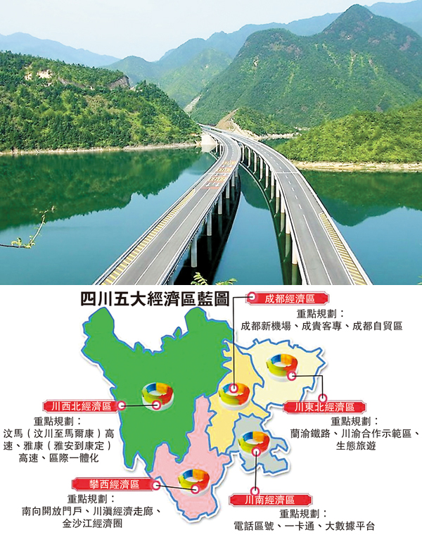 香港文匯報訊 (記者 李兵 成都報道)四川省人民政府官網日前正式對外發佈,成都、川南、川東北、攀西和川西北五大經濟區2015年重點工作方案,讓省內各地發展藍圖變得更加清晰。四川將此項改革放在基礎較好的成(都)德(陽)綿(陽)地區,進行先行先試。
