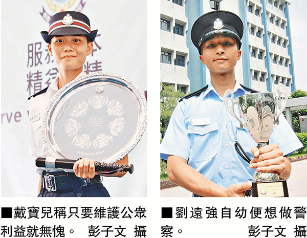 至於今屆「薛富盃」(最優秀結業警員)得主劉遠強表示,自幼想做警察,最喜歡看《男兒本色》。他坦言,自己數年前就讀副學士時投考警員失敗,但「邊度跌倒邊度企起身」,故在擁學士學位後仍選擇再次投考警員,計劃累積經驗後再投考督察。他又說,家人與朋友全部支持他加入警隊,他會按警隊宗旨,公平公正執法。 ■記者 陳敏婷
