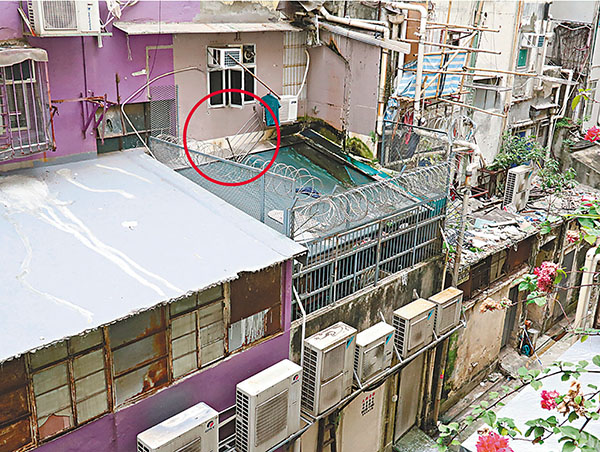 ■新填地街賭檔窗外的晾衣架(紅圈)懷疑被踩斷。劉友光 攝