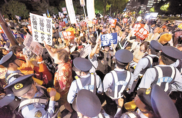 前晚再有大批民眾參加國會前的集會,估計有4.5萬人參與,他們揮動熒光棒,高呼「廢案」及「反對強行表決」等口號。著名作家大江健三郎稱,「若法案成立,和平法之下的日本將不復存在。」民主黨黨魁岡田克也發言時,警告強行表決安保法案將成為戰後民主的污點,在野黨會努力爭取廢案。昨日續有逾一萬人在國會外集會,主辦團體稱今日起會每天舉行。