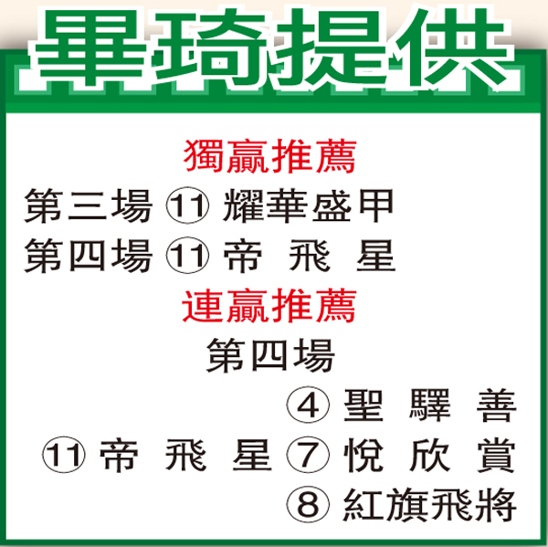 「耀華盛甲」助手彭福公園踱一圈,貼欄而回,出腳靈活有勁,馬身肥瘦適中,精神奕奕,埋門狀態更進一步。