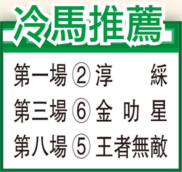 第八場、第二班、一六五○米。「王者無敵」名氣大過乜,個名又夠霸氣,但跑落就激死人,因為上季跑髐C場竟然只得兩場季軍咁大把,不過魒汐氻@哩一戰即獲季軍就俾人有囍w慰,點解咁講,因為僅輸俾兩隻路程好手「帝聖神駒」同埋「聰敏不凡」梗係唔失禮,而跑第四鵅u醒目名駒」鬗G班同程已贏過馬,由此反映,今次第二度出戰窄場鵅u王者無敵」已具贏馬條件。