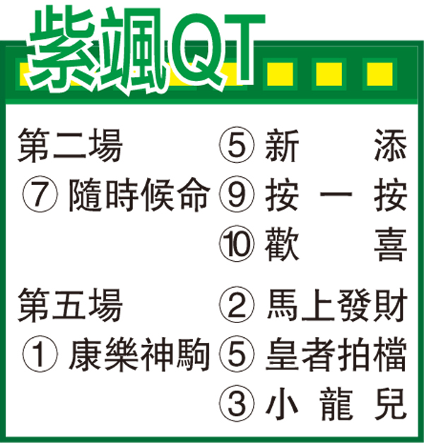 第五場、第三班、一六五○米。高伯新馬房上年度來港的三歲棗色德國自購馬「康樂神駒」。其父Areion,屬九五年棗色德國馬,源自美國馬Big Shuffle 一族。其母Sun Valley,屬○三年栗色德國馬,源自德國馬Lando 一族。「康樂神駒」來港前跑過四仗,得冠亞季各一,全部來自千六米。「康樂神駒」今年四月份開始操練,至今共試閘兩次,埋門所見狀態漸入佳境,初出已有本錢介入一爭,不妨視為半冷馬看待。
