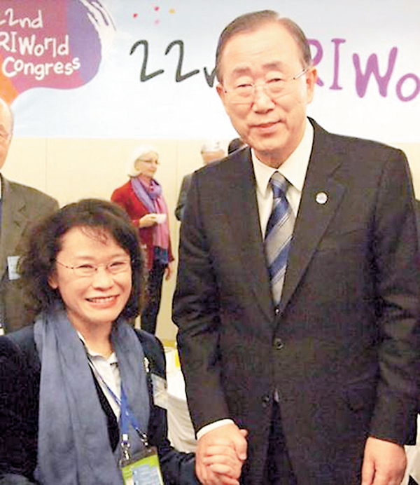 ■張海迪與聯合國秘書長潘基文握手。本報北京傳真