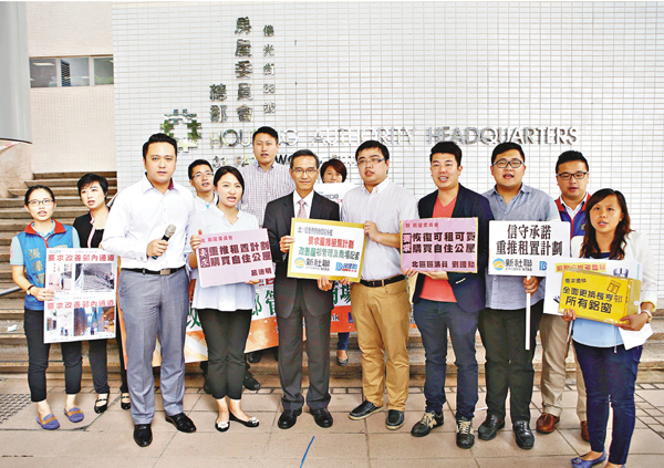 新社聯10多名成員昨日趁房委會資助房屋小組委員會開會期間,到何文田房委會總部請願。他們手持橫額,要求政府重推「租置計劃」,讓公屋居民以較低的價錢購買現居單位,既可免去額外的裝修費,亦可避免搬遷帶來的不便,一舉兩得。