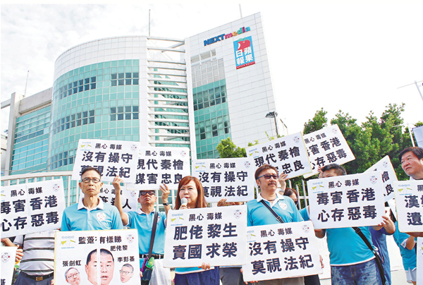 ■正義聯盟黨到壹傳媒總部抗議,指摘集團旗下媒體多次報道失實及創辦人黎智英破壞香港安穩。 莊禮傑 攝
