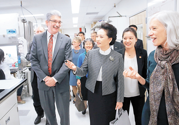 當地時間9月23日,國家主席習近平夫人彭麗媛在西雅圖參觀專門從事癌症及致命傳染病研究的福瑞德.哈金森研究中心。新華社