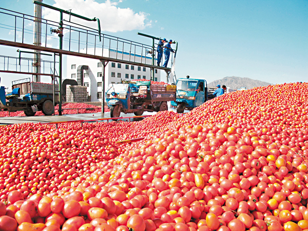白色的棉花、黑色的煤炭、紅色的番茄和辣椒......在新疆的「顏色經濟」中,紅色尤為值得一提。因這裡日照強烈且日照時間長,導致番茄的品質明顯優於其他地方的同類產品。記者日前在中糧屯河股份有限公司位於新疆昌吉回族自治州境內的5,000畝番茄種植基地看到,一望無垠的番茄田裡已經是碩果纍纍。據基地負責人介紹,「這裡的番茄一株可以生長70顆,每顆番茄可達70克,一畝地下來產量在10噸以上,利潤在1,000元以上。」負責人還告訴本報記者,這裡的番茄田實現了全程機械化採摘,當天採當天就可以加工完。面對國家「一帶一路」戰略帶來的巨大商機,昌吉國家農業科技園區高新農業發展局副局長杜曉東表示非常看好,希望新疆的紅色產業和優質的農產品能夠更多地走出國門,走向世界。