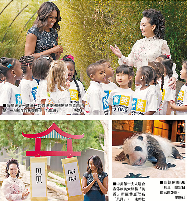 香港文匯報訊 當地時間25日上午,彭麗媛與美國第一夫人米歇爾一起前往位於華盛頓特區的美國史密森尼國家動物園看熊貓,其間聯合宣佈旅美大熊貓「美香」新誕幼崽取名「貝貝」,與姐姐「寶寶」湊成「寶貝」一對。
