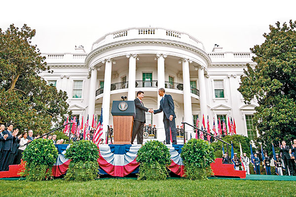 ■美國總統奧巴馬和夫人米歇爾在白宮南草坪為到訪的中國國家主席習近平及夫人彭麗媛舉行歡迎儀式。兩國元首在儀式上講話後握手。美聯社