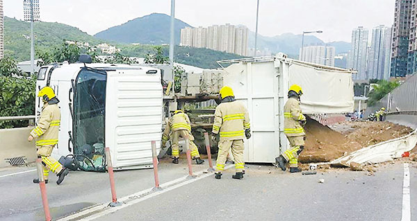 事發昨晨9時許,一名56歲姓李司機駕駛一輛重型泥頭車,滿載泥沙沿將軍澳環保大道駛向工業h,途至昭信路對出行車天橋,突然失控先撞向路邊隔音屏,其中6個隔音屏被撞毀,泥頭車之後餘勢未了,反彈出路面向左翻側,再滑行約30米始停下,貨斗上泥頭散滿兩條行車線。