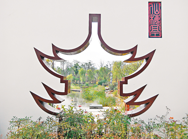 ■武漢園博園變廢為綠,透過岳陽園鏤空圖案可見園區綠化景觀。 記者何芯 攝