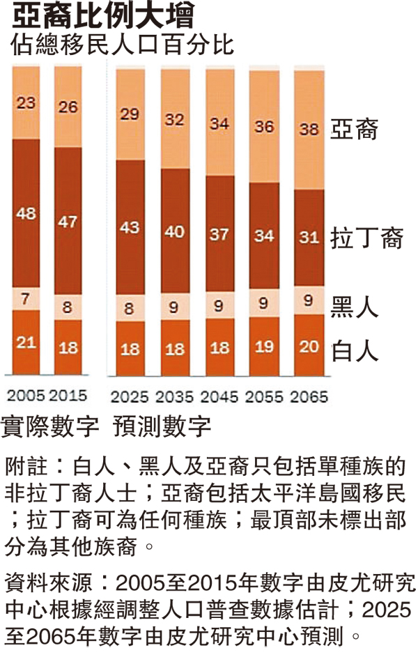 美國移民人口近數十年持續增長,皮尤研究中心報告顯示,在50年後,新移民佔美國人口比例將從現時的14%增至18%,超越上世紀初的高峰。由於拉丁美洲及墨西哥出生率下降,亞裔移民將於2055年超越拉丁裔移民,成為美國最大的移民群體,到2065年更會增至7,800萬,佔移民人口的38%。