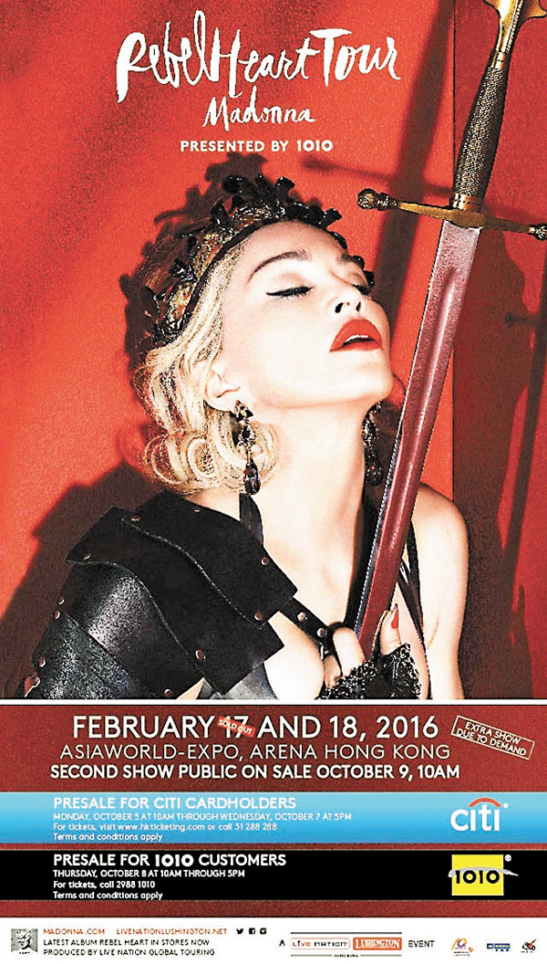 ¬ü°ê¼Ö¾Â¤j©j¤j³Á·í®R(Madonna)¡A¦«e¸¨¹ê±N©ó©ú¦~2¤ë17¤é°²¨È¬w°ê»Ú³ÕÄýÀ]Arena¶}ÄÌ¡A·S¨Ó¤@°}·m¸¼ö¼é¡Aªù²¼¤w¤õ³t°âÁj¡C¥D¿ì³æ¦ì¬Q¤é«Å§G¥[¶}¤@³õ¥Hº¡¨¬´ä°g¡A¤é´Á¬°©ú¦~2¤ë18¤é¡A´«¨¥¤§®R©j±N·|¦b©ú¦~2¤ë17¡B18¤é³s¶}¨âÄÌ¡I¥[³õªù²¼±N©ó10¤ë9¤é¦¤W10®É§@¤½¶}µo°â¡A¦Ó»ùÈ$11,888ªºVIPªù²¼¨Ì¦³°â¡C
