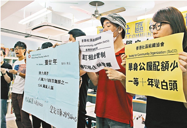社協組織幹事呂綺珊指出,現時公屋平均輪候時間達3.4年,卻並未將14萬以上非長者一人申請計算在內,且「配額制單位上限雖由本來的2,000個上調至2,200個,但去年便已有近60%餘額。」社協社區組織幹事戚居偉認為現行房屋政策過於側重於家庭,忽視一人住戶需求上升趨勢,配額及計分制更令一眾單身人士隨時由「隊頭」變「隊尾」,要求房署重新檢討計分制並為政策重新定位。