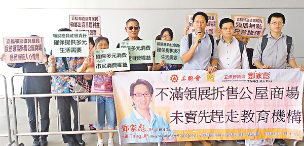 鄧家彪昨晨聯同北區區議員溫和達及觀塘區議員何啟明到領展黃大仙分區管理中心大堂請願。他們擔心新買家入場會大幅加租及削減人手,又指拆售商場會導致小本經營的商戶難以生存,同時影響公屋基層市民的日常生活。